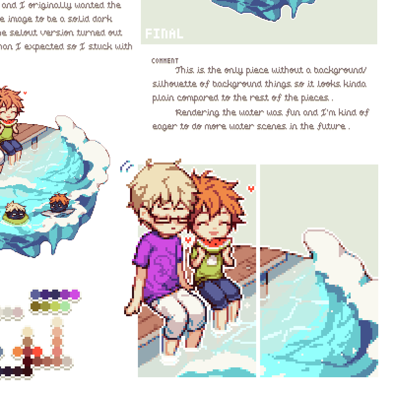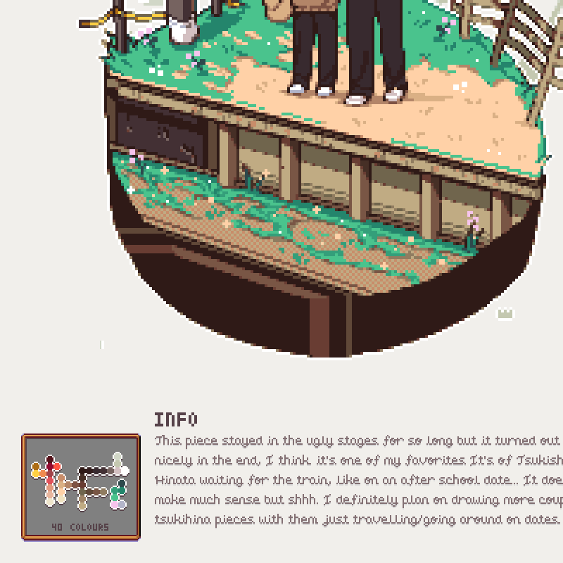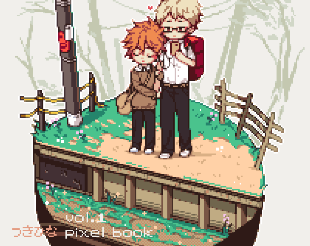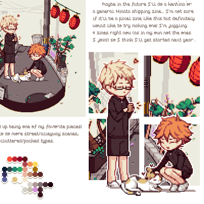 A pixel zine dedicated to Tsukihina! This is the first in a series of Haikyuu pixel illustration zines. The zine contains each illustration, a step by step process, plus some comments from me.